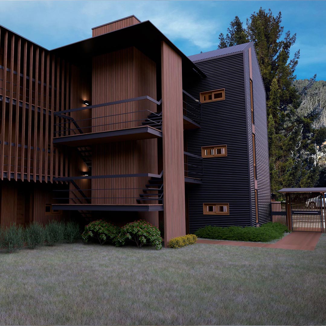 El edificio estará emplazado sobre plateas de hormigón armado y será construido en madera laminada según un sistema de columnas, vigas y losas intermedias pre-moldeadas que serán ensambladas en obra mediante herrajes específicamente diseñados para tal fin. La aislación térmica y acústica en muros medianeros exteriores y techos son premisa fundamental de este proyecto que se hará celulosa inyectada. Las carpinterías serán de PVC de alta prestación con vidrios dobles DVH (doble vidriado hermético) en los vidrios exteriores. Los revestimientos exteriores serán de chapa prepintada, madera o siding según ubicación.