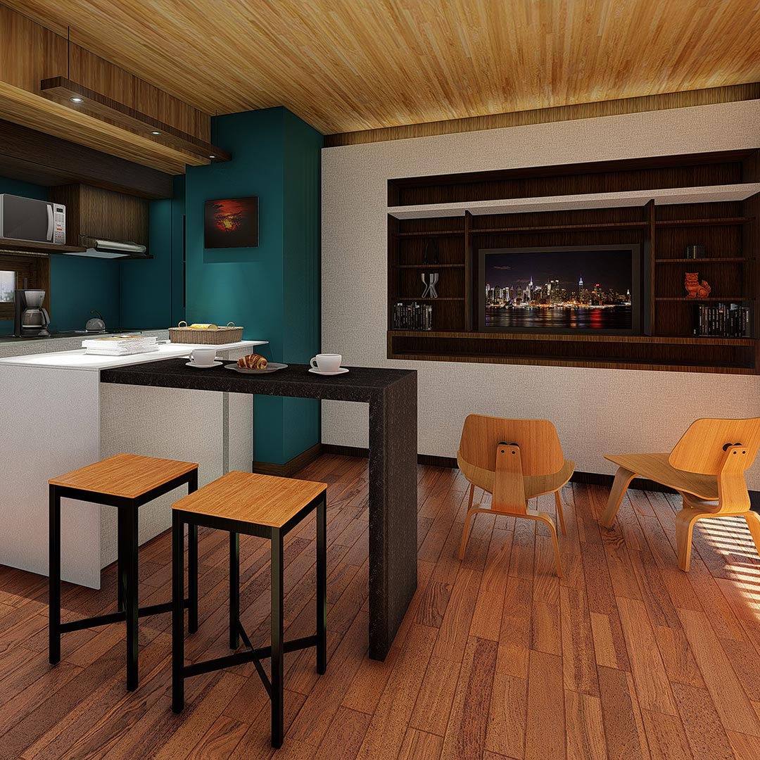 El diseño de iluminación esta especialmente pensada en la ambientación con tiras de led y apliques. El mobiliario móvil estará compuesto por 2 poltronas, 1 mesa chica, 2 sillas.